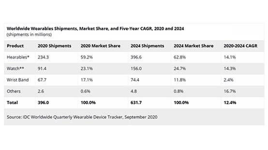 根據(jù)IDC發(fā)布的最新數(shù)據(jù),2020年全球可穿戴設備的出貨量預計可達到3.96億臺,與2019年相比增長14.5%。如果從可穿戴細分市場來看,可聽式穿戴設備(Hearables)占到了總出貨量的近六成,表現(xiàn)十分搶眼。