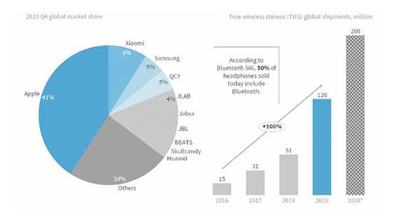 這也引發(fā)了其他友商的入局和跟進,最終成就了TWS市場整體的繁榮。根據(jù)IDC早前的市場分析,TWS耳機在過去幾年中一直保持著100%的增長率,2019年的出貨量達到了1.2億臺,而2020年底有望突破2億臺。