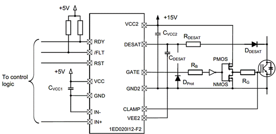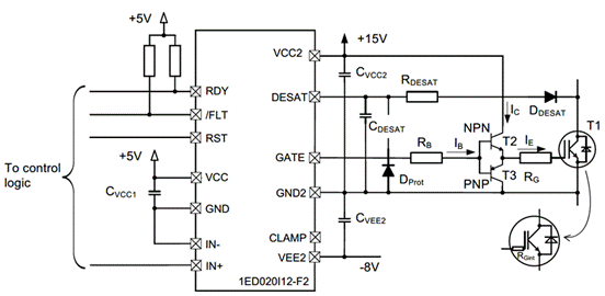 以1ED020I12-F2電流拓展設(shè)計(jì)為例,例子中帶有源米勒鉗位功能: