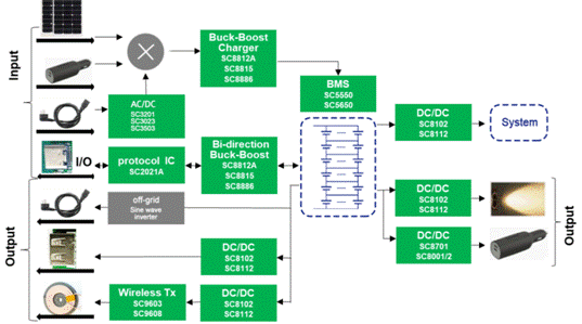 便攜式儲(chǔ)能電源的系統(tǒng)架構(gòu),與我們常見(jiàn)的充電寶較為類似,但輸入輸出功率更大、功能更多,對(duì)安全性、可靠性的要求也更高。下圖為便攜式儲(chǔ)能系統(tǒng)的內(nèi)部功能架構(gòu)圖,其中綠色部分為南芯半導(dǎo)體可提供的芯片方案。