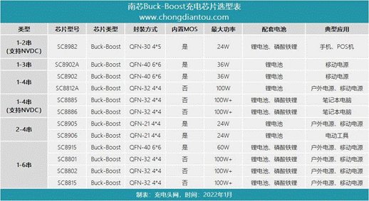 南芯升降壓芯片按照電池?cái)?shù)量可以分為1-2串、1-3串、1-4串、2-4串、1-6串等多種類型,從內(nèi)置MOS支持24W輸出的單芯片到外掛MOS支持100W以上的雙向快充控制器均有布局;并且很多款芯片不僅支持鋰離子電池,而且還支持磷酸鐵鋰電池,既能滿足當(dāng)下20-100W快充移動(dòng)電源的開(kāi)發(fā),也能夠讓?xiě)敉怆娫磳?shí)現(xiàn)大功率雙向快充,增加產(chǎn)品賣點(diǎn)。南芯Buck-Boost芯片可適用于多種場(chǎng)景,如:車載充電、快充移動(dòng)電源、USB hub、多口適配器、無(wú)人機(jī)、藍(lán)牙音箱、戶外電源、工業(yè)應(yīng)用等。