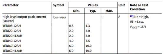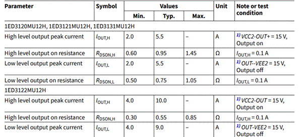 首先來看一下這個驅動峰值電流的定義方式。這個很重要,不同公司的產品往往宣傳說法不一樣,所以要參考規(guī)格書。以下圖1是英飛凌的1EDI系列產品的電流表。比如1EDI60I12AH,我們常說它是6A的驅動。事實上,這個6A是它的最小值而它的典型值是10A。又比如圖2中的英飛凌新產品1ED3122MU12H,我們稱它為10A的驅動,而這個卻是典型值,但后面的測試條件欄里卻寫著VCC2-OUT=15V,這將是最大值里的典型值。繞口了有沒有?那是不是說明兩者的驅動帶載能力一樣的呢?如果不一樣又有什么差異?