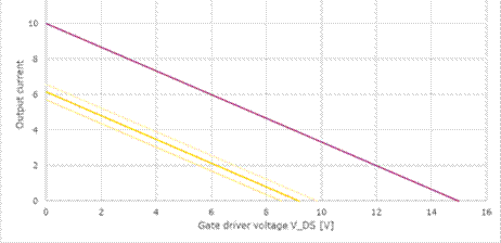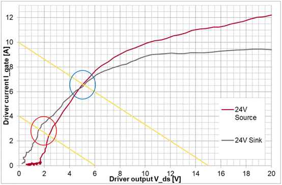 但是實際中,無論是處于EMI的考量還是為了保護續(xù)流二極管,必然會使用門極電阻,而且為了功率門極不處于欠阻尼狀態(tài),Rg≥√(L⁄C)。為了分析方便,我們先不考慮門極回路里的電感且把驅動內部的MOS當作一個可變電阻處理,那么如圖5,可以求出ig=(VCC-VDS-Vge)/Rg,用圖4的坐標形式的話,將會是一系列平行的斜線,如圖6。斜率和電阻值相關,比如圖中的電阻是1.5Ω。門極電壓每充1V,斜線就沿橫坐標往左平移1V。把圖4和圖6結合在一起得到了圖7,交點就是實際輸出的峰值電流,由于實際電路中肯定還有寄生電感,會限制到達峰值電流的速度,導致真實電流值更小。對于一般的中小功率而言,1.5Ω的門極電阻算小的了,理想無感的交點在6A。如果門極電阻再大些,交點電流將更低。這樣輸出電流的能力被電阻限制住了。所以英飛凌宣稱的6A并不是15V時對應的電流值,而是考慮在功率器件標稱電流對應的米勒平臺時的電流能力。如果直接從橫坐標15V的地方找對應的電流甚至大于10A了。