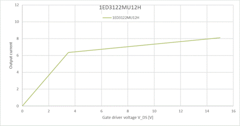 下面我們再來看看新款的X3產品情況怎么樣。英飛凌X3系列的產品的輸出部分直接采用新一代的單獨的PMOS作為開通輸出級,如圖8所示。而不是像以前的產品那樣使用PMOS與NMOS結合的方式(如圖5)。選擇1ED3122MU12H產品繪制如圖9的電流能力曲線(根據設計參數所得而非實際測量)。按照IGBT標稱電流時的米勒電壓一般為9~10V來看,找到橫坐標5、6V的時候電流能力達到了6A以上。和之前1EDI60I12AF相當,如果用最大電流值標稱的話就是10A了。由此可以看出和以前PMOS/NMOS結合的產品峰值電流差不多。但是由于PMOS的輸出不受限于Vgs,不會像圖7的source電流那樣有2V左右的閾值,而是和sink電流一樣可以直接到零!這樣實際測的話曲線會和圖7的sink電流類似,我們暫時用它假代PMOS的輸出曲線。可以看到即使在米勒電平時兩者的輸出限值一樣都是6A,但是一旦有外加的門極電阻后,PMOS的輸出能力更加出色,如圖7紅色圈所示。
