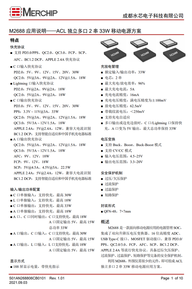 成都水芯的M2688是一款高度集成的電源管理芯片,支持2-6串電池,可以支持30-100W功率,集成全部充電寶功能、快充協(xié)議和MCU功能。基于M2688的33W充電寶方案技術(shù)規(guī)格,如下所示。