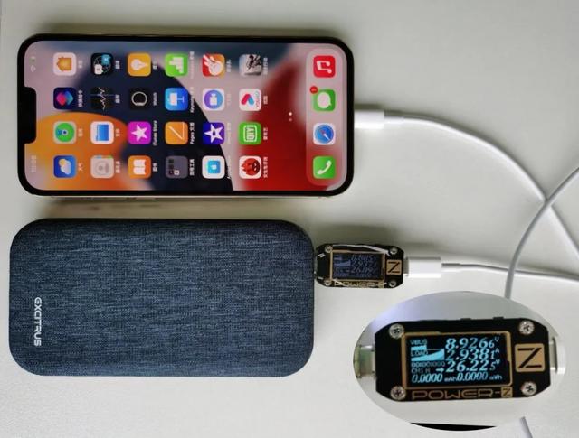 采用天寶30W充電寶經(jīng)過(guò)Chargerlab POWER-Z KM001C測(cè)試儀連接到iPhone13進(jìn)行PD快充。從實(shí)測(cè)結(jié)果看,充電寶輸出8.92V,電流2.94A,到iPhone13的功率接近27W。