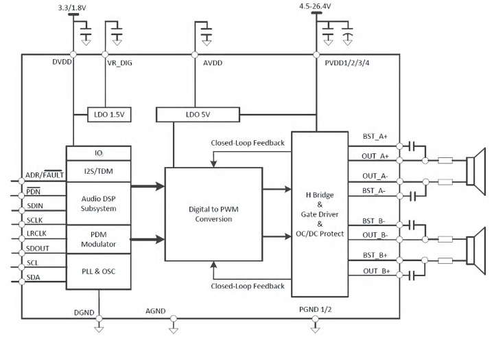 ACM8625 2×26W, 立體聲輸出(8Ω, 22V, THD+N = 1%) 2×32W, 立體聲輸出 (8Ω, 22V, THD+N = 10%) TAS5805/ACM8628/ACM8622 TSSOP-28 4.5V-26.4V I2S數(shù)字輸入26W立體聲D類音頻功放芯片、內(nèi)置DSP小音量低頻增強(qiáng)等算法