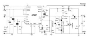 在傳統(tǒng)的異步降壓轉(zhuǎn)換器中,高邊 MOSFET 開啟,電流從輸入引腳流向電感(線圈)。為了輸出較低的電壓,降壓轉(zhuǎn)換器將關(guān)閉高端,這將輸入電壓降低到零,但同時也導(dǎo)致電感器對負責(zé)調(diào)節(jié)負載的輸出電容器充電。為確保電容器保持充電狀態(tài),高端再次開啟一段時間,從而重新啟動循環(huán)。此外,為了提高效率和縮小芯片尺寸,A7987 使用 N 溝道 MOSFET 作為高端開關(guān)。然而,由于驅(qū)動它需要高柵極電壓,因此該組件還必須集成一個用作升壓轉(zhuǎn)換器的自舉電路。