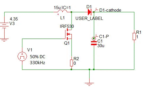 在圖 3中,升壓轉(zhuǎn)換器電源系統(tǒng)由經(jīng)典的 MOSFET-二極管-電感器組合表示。MOSFET 以 50% 的占空比進(jìn)行開關(guān),輸入電壓源 V3 設(shè)置為產(chǎn)生 6V 的輸出電壓。輸出電壓、電感器和電容器值與上述降壓轉(zhuǎn)換器的情況相同。在這兩種情況下,相同的 LC 無源器件將 6V 提供給 1Ω。