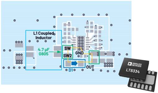 LT8334異步升壓轉(zhuǎn)換器中包含一個集成式5 A、40 V開關(guān)。這個單芯片升壓轉(zhuǎn)換器IC適合用于構(gòu)建12 V輸出SEPIC轉(zhuǎn)換器。圖4顯示標(biāo)準(zhǔn)型12 V、2 A+ SEPIC轉(zhuǎn)換器,其中包含耦合電容C1和耦合電感的兩個電感線圈。由于微型PMEG4030ER續(xù)流二極管D1不是直接附加在開關(guān)節(jié)點(diǎn)上,所以可以輕松將4.7 μF 0805陶瓷型隔直耦合電容置于二極管和開關(guān)節(jié)點(diǎn)之間。在EVAL-LT8334-AZ SEPIC評估板上,熱回路布局保持較小。開關(guān)節(jié)點(diǎn)的銅面積盡可能保持較小,并且盡可能接近開關(guān)引腳,有助于盡可能降低電磁輻射騷擾。請注意,整個熱回路都布局在1層,且開關(guān)節(jié)點(diǎn),或者耦合電容另一側(cè)的耦合開關(guān)節(jié)點(diǎn)上都沒有通孔。這些開關(guān)節(jié)點(diǎn)應(yīng)盡量保持較小,且盡量接近,以實(shí)現(xiàn)出色結(jié)果。LT8334的12引腳DFN封裝有助于熱回路和輻射盡可能保持較小。