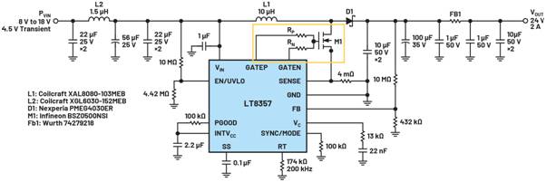 圖4.LT8334 40 V、5 A異步單片式升壓IC被用于SEPIC應(yīng)用中。