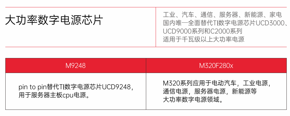 其中,M9248支持pin to pin替代TI數字電源芯片UCD9248,可用于服務器主板CPU電源。而M320系列可應用于電動汽車、工業(yè)電源、通信電源、服務器電源、新能源等大功率數字電源領域。