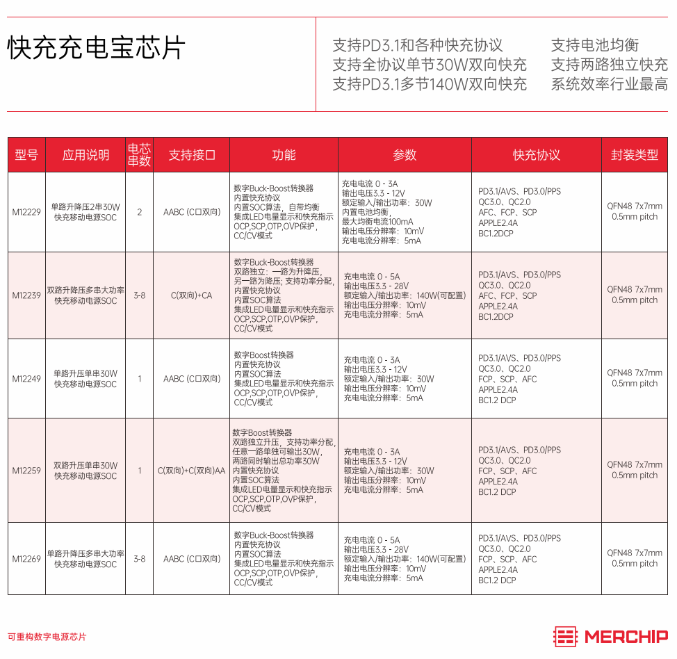 M12239 M12239是一款面向雙路獨立的多電芯大功率移動電源應用的專用 SOC,集成了同步升降壓變換器、電池 充放電管理模塊、顯示模塊、電量計算模塊,提供最大 140W 輸入/輸出功率,支持 PD3.1、QC3.0、AFC、FCP、SCP、BC1.2 DCP 等主流快充協議,并提供過壓/欠壓、過充/過放、過溫等完備的保護功能。配合極簡的外圍 電路,即可組成單 C口大功率移動電源。輔以DC-DC芯片,可以擴展為3-8串電池雙路獨立的多口大功率移動電源。 QFN-48 3.3V-28V 雙路3-8節(jié)多串升降壓140W大功率移動電源SOC