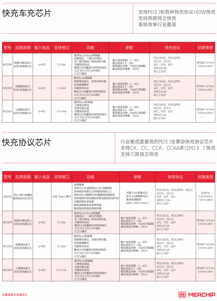 水芯推出的快充協議芯片系列,支持多口PD3.1等協議快充。值得一提的是,系列中的M12349、M12359、M12369三款產品還可應用在車充產品中。