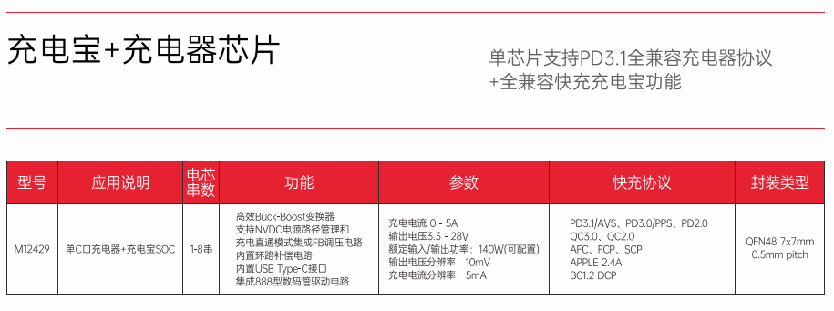 水芯M12429采用OFN48 7×7mm 0.5mm pitch封裝,充電電流0-5A,輸出電壓為3.3-28V,輸出電壓分辨率為10mV,充電電流分辨率為5mA,額定輸出功率最高達140W,并且支持配置;支持PD3.1/AVS、PD3.0/PPS、QC3.0、QC2.0、AFC、FCP、SCP、APPLE 2.4A、BC1.2 DCP等協議。