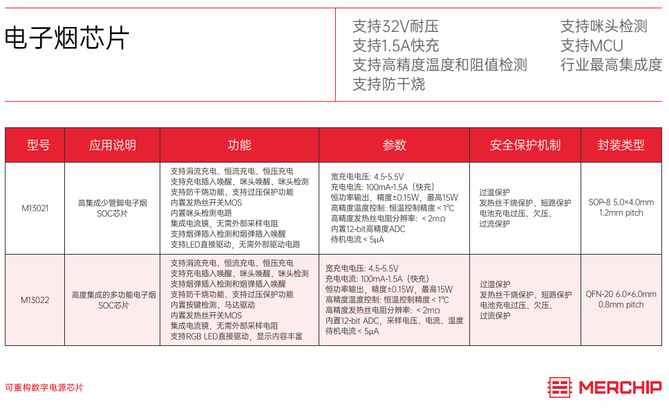 水芯電子針對電子煙市場,推出了M13021和M13022兩款電子煙芯片,這兩款芯片支持MCU、32V耐壓、1.5A快充電流、高精度溫度和阻值檢測、咪頭檢測、防干燒等眾多特性。