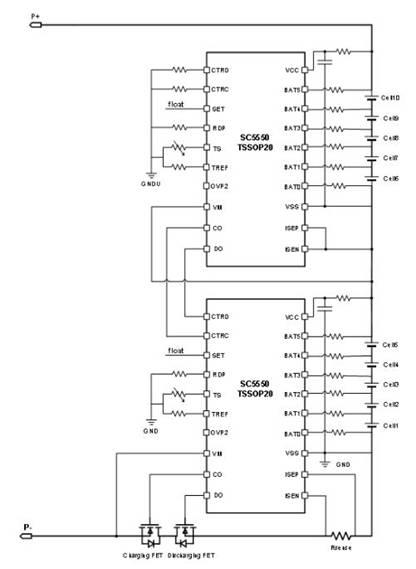 圖4. SC5550通過(guò)堆疊可支持6~15串電池