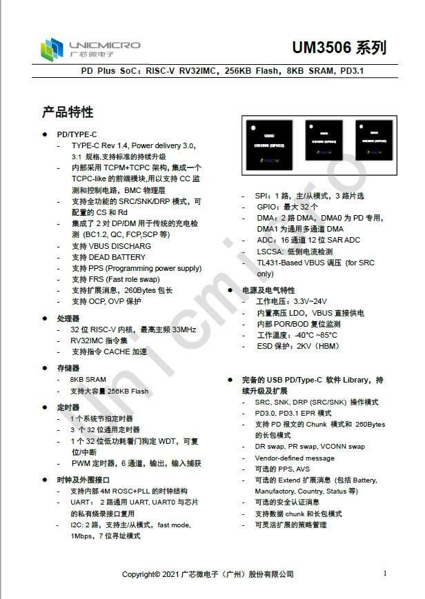 封裝封面,UM3506家族共有多個封裝尺寸,分別是QFN32、QFN24,適用于工程師根據PCB大小布局進行方案開發(fā)設計。充電頭網向廣芯微了解到,UM3506系列采用了當下關注度相當高的RISC-V架構,這也是業(yè)界率先將RISC-V與USB PD3.1相結合的快充芯片。
