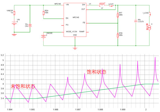 還是以MP2145為例,使用MPSmart仿真工具進行仿真,從仿真波形可以知道,當電感沒有飽和時,電感電流是一個斜率一定的三角波,當電感飽和時電感電流波形會有一個明顯畸變,這是由于飽和后感量降低造成的。