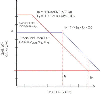在圖 2 中,信號在放大器的反相側(cè)獲得。TIA 的直流增益等于 V OUT /I PD。方便的是,該增益等于反饋電阻 R F。隨著頻率的增加,增益保持穩(wěn)定,直到達(dá)到拐角頻率,其中 R F和 C F形成一個(gè)低通濾波器。