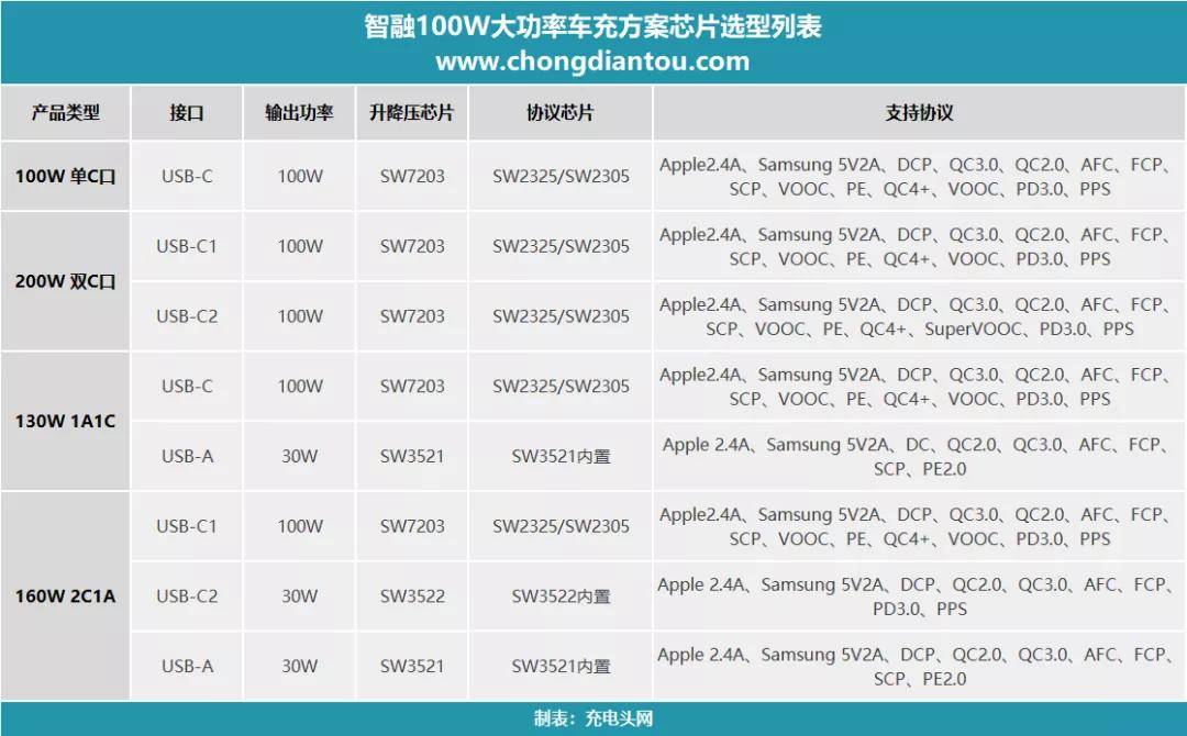 針對于大功率多口獨立快充車充市場,無論是單口100W還是雙口盲插,也無論是130W雙口獨立快充,還是160W三口獨立快充,智融都可以提供全套芯片,并且實現全協議快充以及精簡的外圍電路。