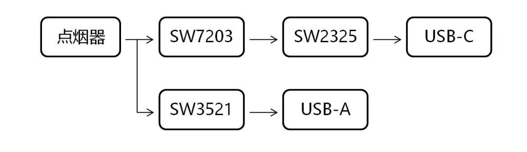 智融雙口100W車充方案同樣可以使用智融SW7203+SW2325/SW2305設計,可實現單口最高輸出功率100W,同時支持雙口功率盲插,并且支持輸出功率智能分配功能。SW2325/SW2305支持所有通用快充協議及大部分私有協議,并且支持USB-C口升級協議功能。