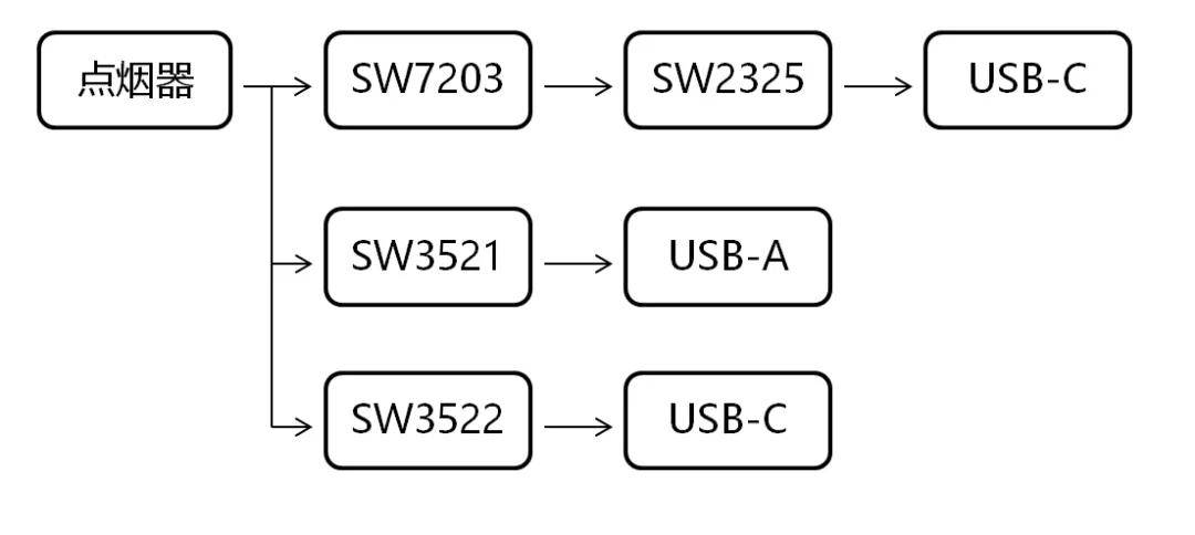 雙獨立輸出的130W 1A1C雙口車充方案,可以采用SW7203+SW2325/SW2305實現C口100W輸出,另外一路A口采用SW3522內置開關管的全集成降壓轉換器實現高集成的A口30W輸出。殼實現雙口真正獨立快充,而不會雙口輸出時降為5V。