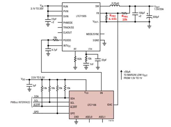如下圖,使用LTC7150S作為DC-DC開關(guān)穩(wěn)壓器,提供1.5V電壓輸出。假設(shè)我們現(xiàn)在需要電源在1.5V到1.0V之間對電源輸出電壓進行動態(tài)調(diào)整。
