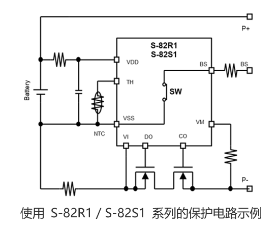 (1)通過使用電池電壓監(jiān)視端子(BS端子),即使在快速充電期間也可以準(zhǔn)確監(jiān)視電池電壓(全系列通用);(2)業(yè)界頂級(jí)精度 : 充放電過電流檢測電壓精度為±1 mV(S-82S1系列)、±1.5 mV(S-82R1系列),可以在抑制過電流檢測的變化的同時(shí),降低電流檢測電阻的電阻;(3)通過將NTC熱敏電阻連接到熱敏電阻連接端子(TH端子),實(shí)現(xiàn)過熱保護(hù)功能(全系列通用)。