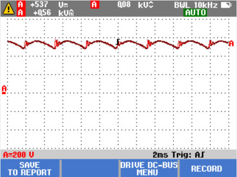 驅(qū)動器內(nèi)部的交流-直流轉(zhuǎn)換至關(guān)重要。為獲得最佳驅(qū)動器性能,必須要保證電壓正確、充分濾波并保持低紋波水平。高波紋電壓可能說明電容器存在故障或所連接電機的規(guī)格不正確。Fluke MDA-500 系列 Motor Drive Analyzer 的記錄功能可在承受負載時的工作模式下對直流總線的性能進行動態(tài)檢查。還可以使用 Fluke ScopeMeter® Test Tool 或高級萬用表進行此測試。