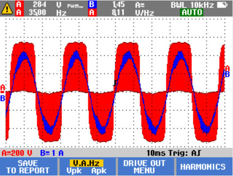 · 使用相間測量檢查電壓調(diào)制。高電壓峰值可能會損壞電機繞組絕緣并導致驅(qū)動器跳閘。電壓峰值超過標稱電壓 50% 以上會產(chǎn)生問題。