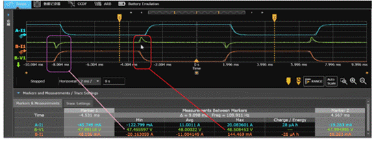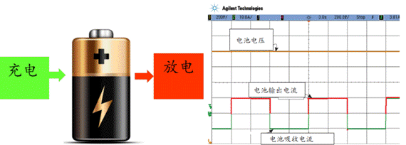 如下圖所示,我們利用APS電源拉載脈沖電流,同時利用其200KSa/s(18bit)高速采樣能力監(jiān)測電池的端電壓,可以看到其變化呈現(xiàn)3個不同階段。