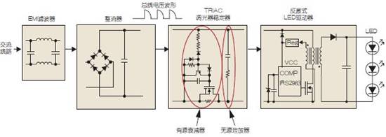 假設(shè)使用LED燈所適用的調(diào)光器來替代該調(diào)光器并不是理想的解決方案,那么可以通過修改LED驅(qū)動(dòng)來解決上述問題,從而實(shí)現(xiàn)LED驅(qū)動(dòng)與標(biāo)準(zhǔn)調(diào)光器的搭配使用。