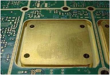 主要采用的措施涉及提供額外的銅表面、使用更厚的走線,以及在產(chǎn)生最大熱量的元器件下方插入散熱孔。一種能散發(fā)更多熱量的更激進的技術(shù),包括把真正的銅塊插入到PCB或施加到最外層,這種銅塊通常呈硬幣形狀,因此得名“銅幣”。在將銅幣單獨加工后,可將其焊接或直接貼附在PCB上,也可以將其插入內(nèi)層,通過散熱孔與外層連接。圖1所示的PCB中制作了一個特殊的空腔來容納一枚銅幣。