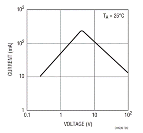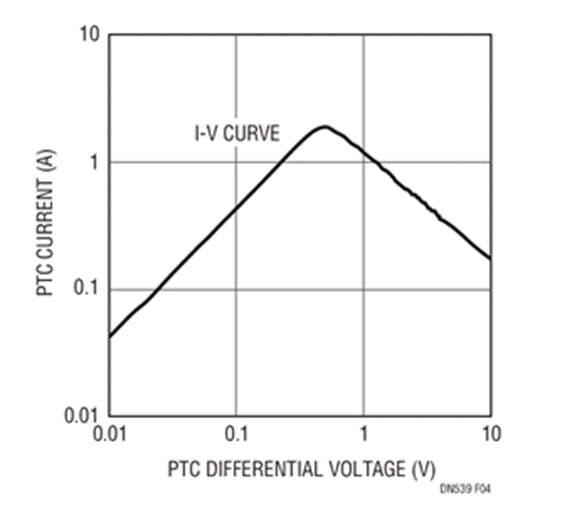 這里的實(shí)例采用了一個(gè)具有 1.9A 跳變電流和 0.27Ω 冷電阻的 PTC (PTGLASARR27M1B51B0)。圖 4 中示出的PTC I-V曲線是在實(shí)驗(yàn)室得出的。