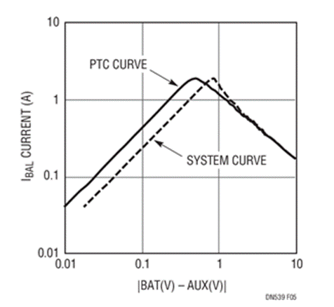 最后,在 AUX 電池和被平衡的電池之間傳輸了足夠的電荷,而且VDIFF開(kāi)始下降。當(dāng)VDIFF減小時(shí),則在另一方向遵循 I-V 特征曲線。隨著 VDIFF 的減小,平衡電流遵循RTOTAL I-V曲線而增大,直至其達(dá)到居里點(diǎn)電流為止。PTC電阻在該點(diǎn)上保持恒定,而平衡電流的變化則遵循RTOTAL 線。