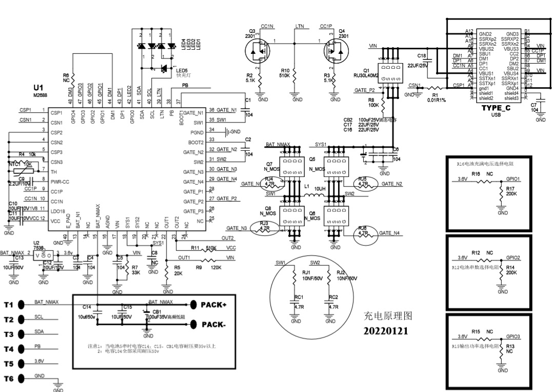 R16: 電池充滿電壓選擇電阻: 4.2V_NC,4.25V_100K,4.3V_200K 4.4V_390~470K,4.45V_590K~680K