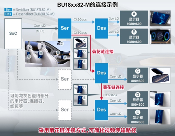 新產(chǎn)品“BU18xx82-M”符合汽車電子產(chǎn)品可靠性標準AEC-Q100,可確保車載應用所需的高可靠性。另外,串行器“BU18TL82-M”支持輸入接口OpenLDI和MIPI-DSI,因此適用于各種SoC。