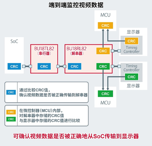 普通的SerDes IC需要成對連接串行器和解串器才能傳輸視頻,而ROHM的新產(chǎn)品,可以用菊花鏈方式連接解串器“BU18RL82-M”,因此可通過單個串行器將視頻傳輸給多個路徑。由于可以減少連接器和線纜的數(shù)量,因此可以簡化視頻傳輸路徑,從而有助于降低應用產(chǎn)品的系統(tǒng)成本和故障風險。此外,新產(chǎn)品作為支持全高清分辨率的SerDes IC,具有通過比較CRC*2值來端到端*3(從SoC到顯示器)監(jiān)控視頻數(shù)據(jù)是否已被正確傳輸?shù)墓δ,有助于提高應用產(chǎn)品的功能安全。