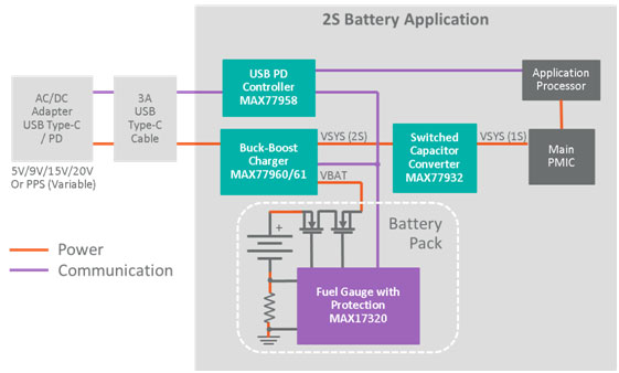 MAX77958可通過其主I2C接口自主控制配套的充電器。MAX77961是一款帶有集成FET的6A降壓-升壓充電器,可為大容量2S和3S鋰電池快速充電。它為USB PD充電提供寬輸入電壓范圍(3.5V至25V),不需要分立FET,并且不論在有無外部處理器的情況下都可以進行配置。在輸入電壓為9VIN、輸出電壓為7.4VOUT、輸出電流為1.5AOUT時,其峰值效率為97%。