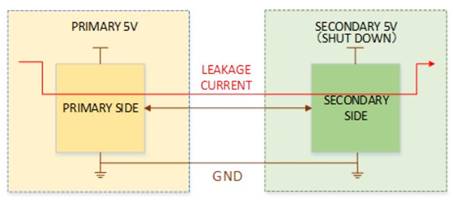 圖2原側(cè)開啟,而次級側(cè)關(guān)閉,該情況下會引起原側(cè)到次級側(cè)漏電;若要避免泄漏電流,則必須將數(shù)字線設(shè)為低電平輸出或高阻抗模式。