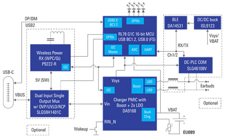 方案中使用的PMIC是瑞薩旗下可配置的單芯片電源管理IC DA9168,其集成的雙LDO和反向升壓功能,可支持USB On-The-Go(USB-OTG)標(biāo)準(zhǔn)。此外,該P(yáng)MIC芯片在非常緊湊的體積內(nèi)實(shí)現(xiàn)了極低的靜態(tài)電流消耗,這使其非常適用于眾多注重空間的、電池供電的消費(fèi)類應(yīng)用。不僅如此,得益于DA9168的多種省電模式,使得產(chǎn)品無(wú)論是閑置存放還是在運(yùn)行中,都可以延長(zhǎng)電池壽命。在供電設(shè)計(jì)方面,方案可通過(guò)USB連接器或單芯片5W無(wú)線電源接收器(P9222-R)為該P(yáng)MIC供電。供電路徑由2:1電源多路復(fù)用器(SLG591401C)自動(dòng)選擇。