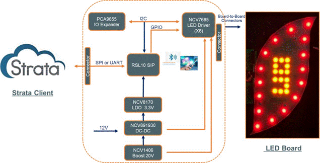 NCV7685芯片來(lái)驅(qū)動(dòng)總共72個(gè)LED節(jié)點(diǎn),以實(shí)現(xiàn)具有可配置參數(shù)和自定義模式的預(yù)定義動(dòng)畫——所有設(shè)置和電路監(jiān)控均可通過(guò)Strata訪問(wèn)。