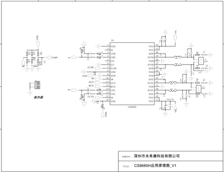 CS8685H是-款2x80W立體聲D類音頻功率放大器,這款器件在頂層設計了散熱焊盤,焊盤上連接散熱器后在供電電壓24V的情況下,最大可以輸出2x75W的連續(xù)功率;通過主從模式的設置可以讓CS8685H實現無限級聯(lián),從而實現系統(tǒng)的多路輸出;CS8685H具備先進的EMI抑制技術,它采用表面貼裝技術,只需少量的外圍器件,便使系統(tǒng)具備高質量的音頻輸出功率。CS8685H內置了過流保護,短路保護和過熱保護,有效的保護芯片在異常的工作條件下不被損壞。CS8685H最高可達93%以上的效率,40V以上的耐壓設計微芯片提供了超高的可靠性,可以有限的降低生產過程中的不良比例。