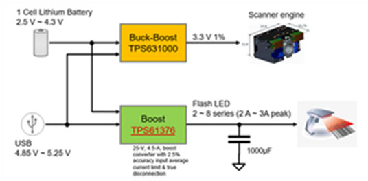 那么,升壓轉(zhuǎn)換器TPS61376是如何助力更高集成度條碼掃描器方案的呢?條碼掃描器通常會(huì)帶有大功率Flash LED用來(lái)做光線(xiàn)發(fā)射,它的瞬時(shí)電流是比較大的,根據(jù)用的LED數(shù)量不同一般2~3A甚至更大。而條碼掃描器的電源是USB或者電池,尤其是USB接口是承受不了這樣的瞬時(shí)大電流,所以通常在系統(tǒng)中加入一個(gè)緩沖電容,由這個(gè)緩沖電容來(lái)提供瞬時(shí)能量,此外,系統(tǒng)中還會(huì)在USB電源供電測(cè)加入限流保護(hù),避免瞬時(shí)大電流將USB電源拉死。同時(shí),電路中需要升壓電路將條碼掃描器的輸入升壓給Flash LED供電。下圖為條碼掃描器系統(tǒng)框圖。