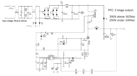 其中,NCP1623A基于創(chuàng)新的谷底同步頻率反走(VSFF),重載條件下工作在臨界導(dǎo)通模式(CrM),輕載時進入非連續(xù)導(dǎo)通模式(DCM),確保在各種負(fù)載下都提供極高能效。NCP1623A提供兩級輸出電壓:當(dāng)輸入低于146 VAC時輸出250 V,輸入高于163 VAC時輸出390 V,其跟隨器升壓能力還大大提高低壓時的能效, 相比較傳統(tǒng)固定輸出,在低壓可提高PFC效率1.5~2%。