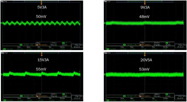 經(jīng)測試,該100 W USB PD適配器參考設(shè)計在各種負(fù)載條件下的紋波和噪聲都低于60 mV,動態(tài)性能穩(wěn)定,EMI和熱性能優(yōu)良。