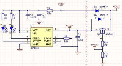 當VBUS處沒有電源輸入時,MOS管Q1的柵極被拉低到地,而此時由于VBAT上接了電池,使得Q1的源極和柵極間有3V以上的電壓,Q1會導通,實現了VBAT向VOUT供電。