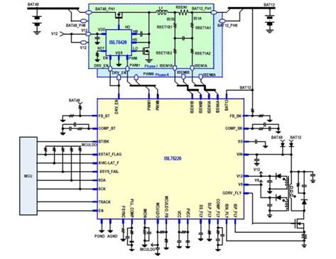 單個瑞薩 ISL78226 設(shè)備可提供高達 3.75 kW 的最大功率,轉(zhuǎn)換效率超過 95%,并且還能夠集成到模塊化主/從架構(gòu)中以提供更高的功率。這種創(chuàng)新設(shè)計使設(shè)計人員能夠支持 48 V 混合動力傳動系統(tǒng)的快速采用,該系統(tǒng)可減少輕度混合動力汽車中使用的排放和燃料消耗,在這種汽車中,電動機連接到內(nèi)燃機燃燒(圖 4)。