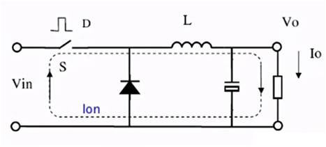 當開關(guān)導(dǎo)通時:輸入電壓Vin加到LC濾波器的輸入端,電感上的電流以固定斜率線性上升。如下圖